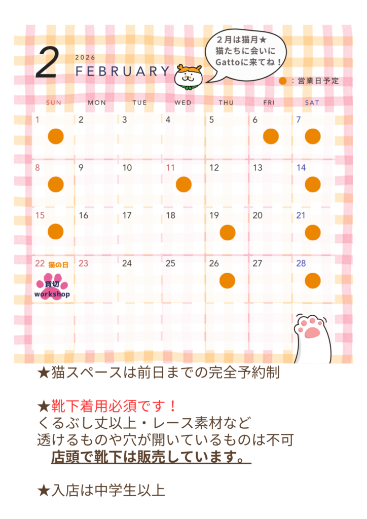 【お知らせ】次の営業日は2/1(日)13時OPEN15時CLOSE(猫スペースは前日までの予約制。雑貨のお買い物のみは、14時半までにご来店ください。お買い物のみは当日予約なしで大歓迎です!)